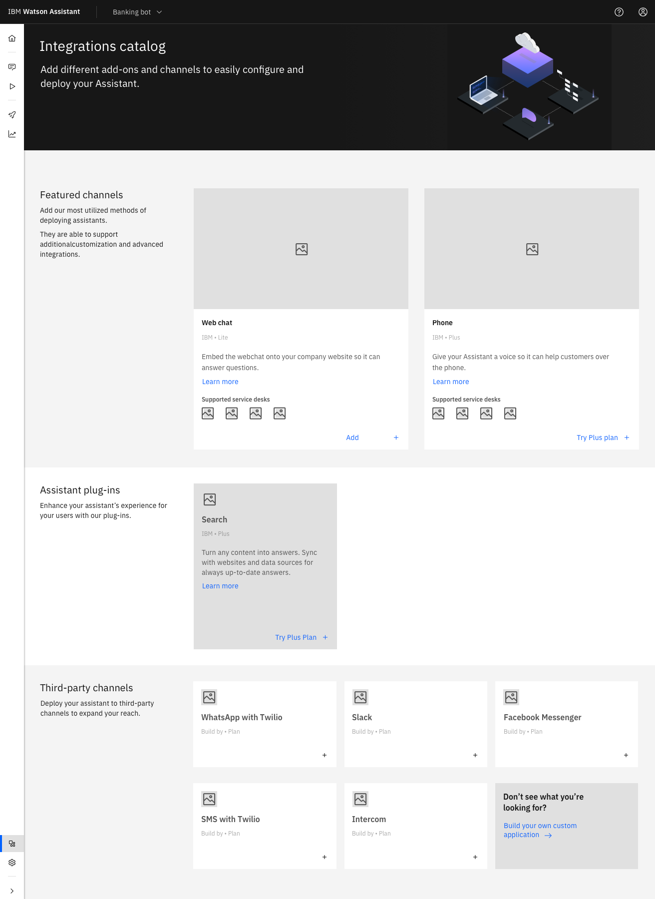 Assistant plug-ins, offering the one available built by IBM but considering the addition of new plug-ins to the catalog in the future.